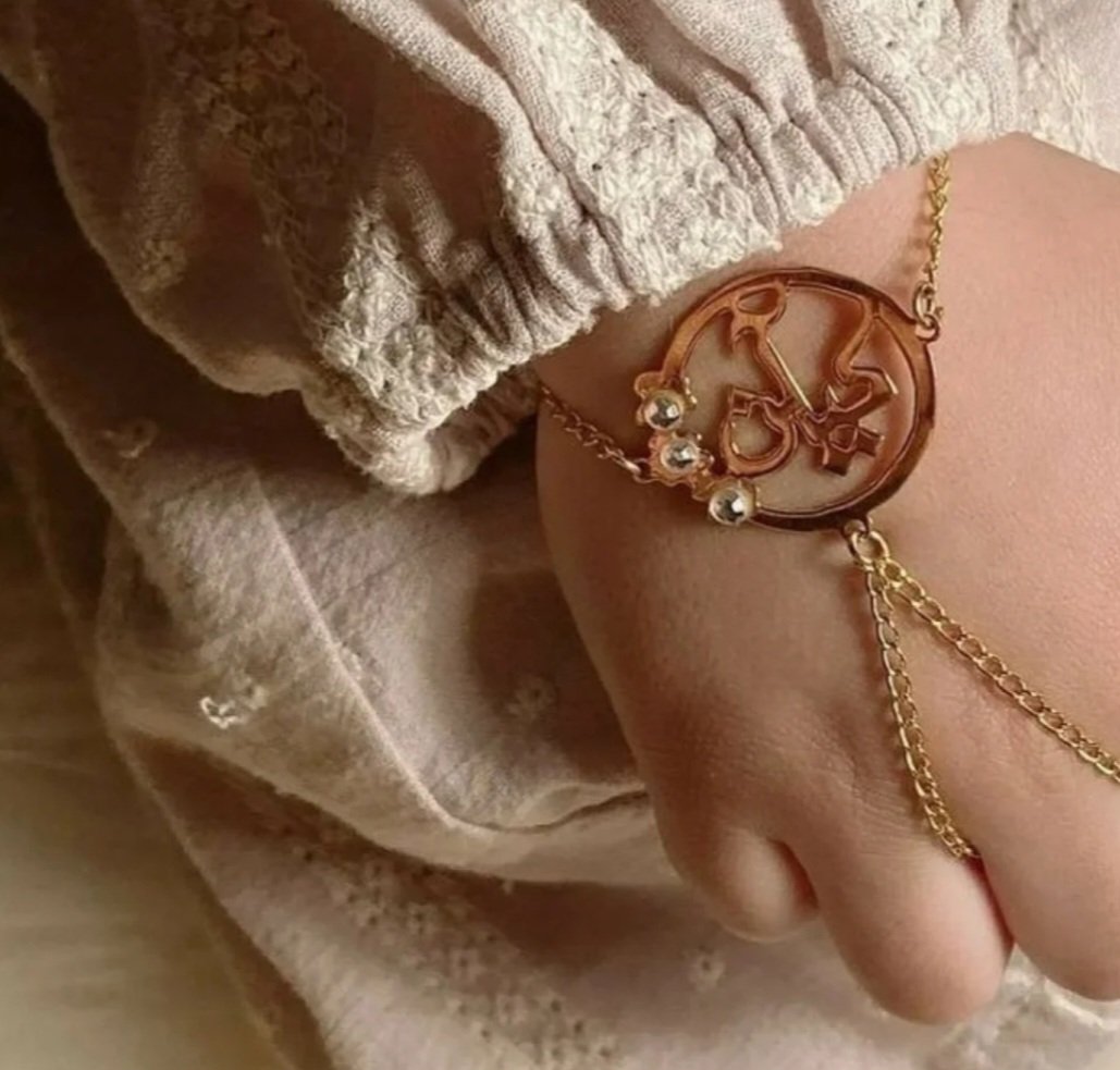 أسوارة أنيقة، ناعمة على بشرة الطفل، بتصميم دائري راقٍ يُبرز الاسم بأسلوب عربي جميل، مع لمسات براقة تضفي سحرًا خاصًا.