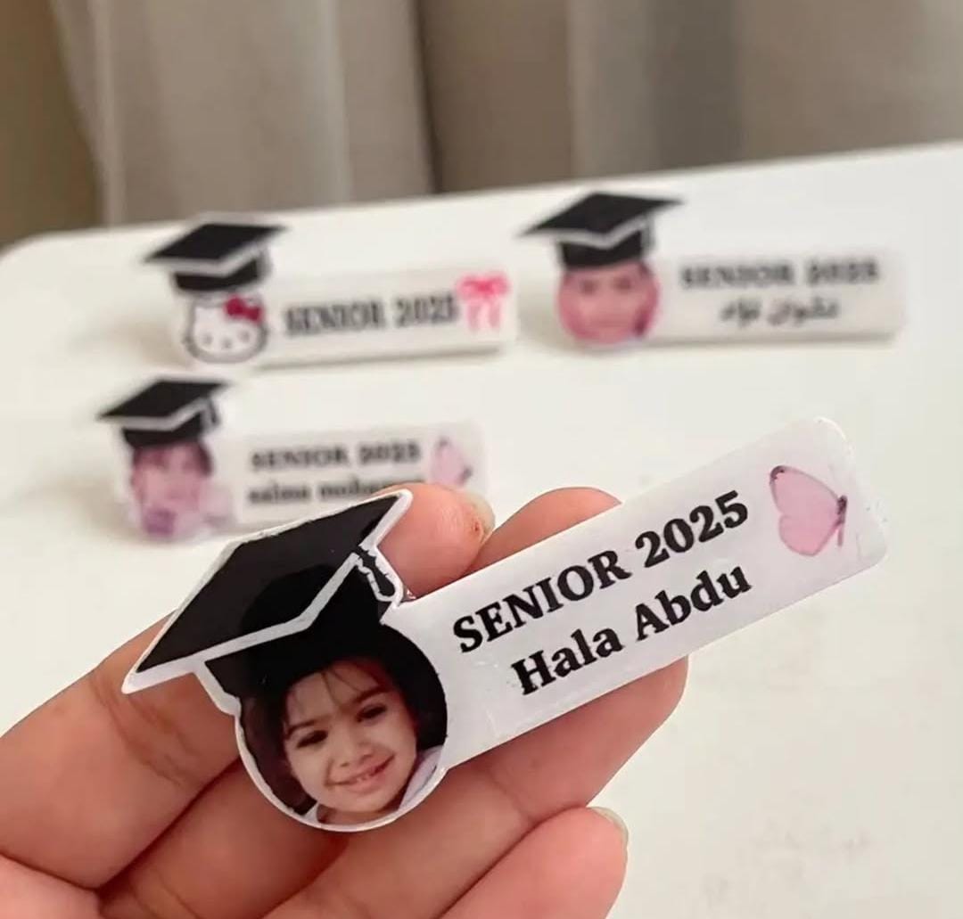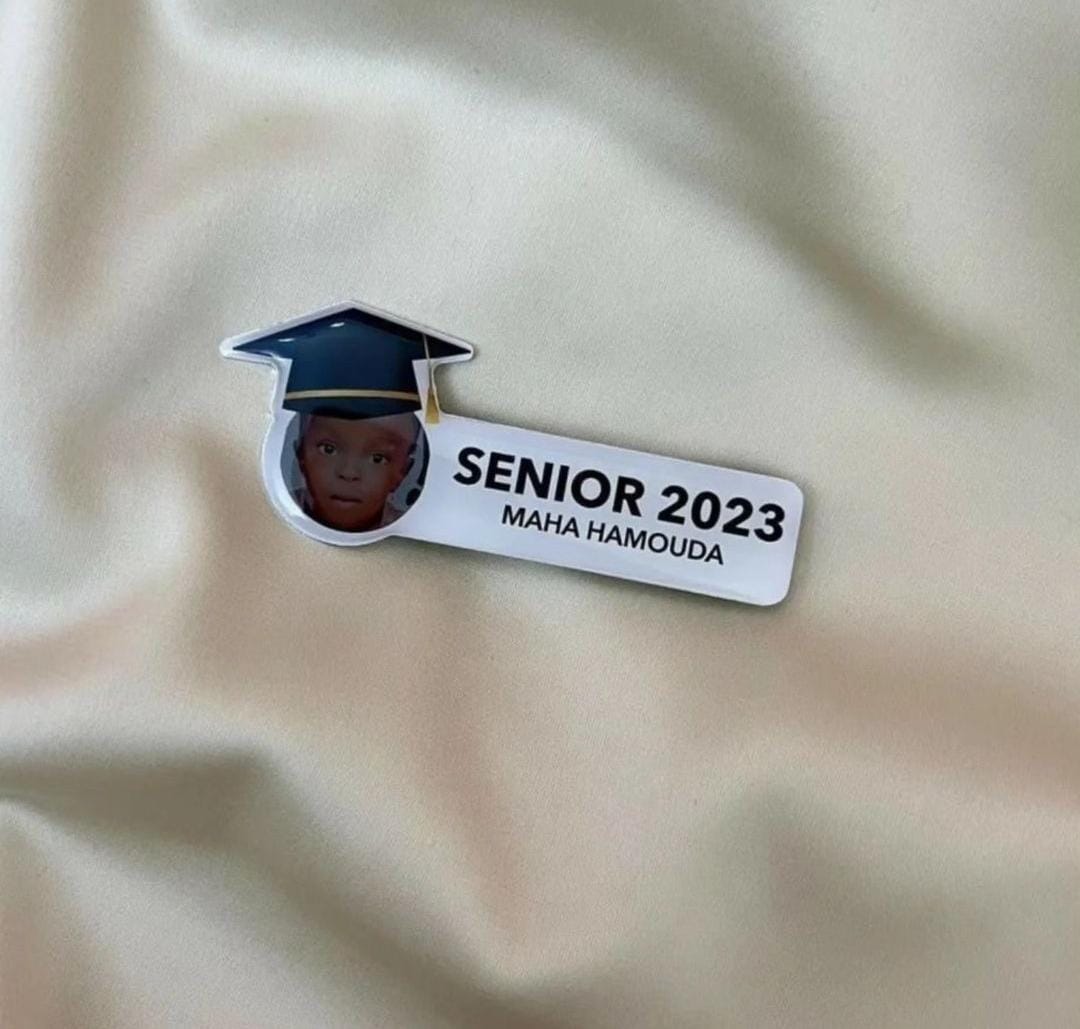 تفاصيل المنتج :بروش تخرج بالاسم بتبصميم جديد وحديث .تفصيل الاسم والصوره حسب الطلب .نوع البروشات : اكريلك مع طباعة الاسم والصوره حسب الطلب .